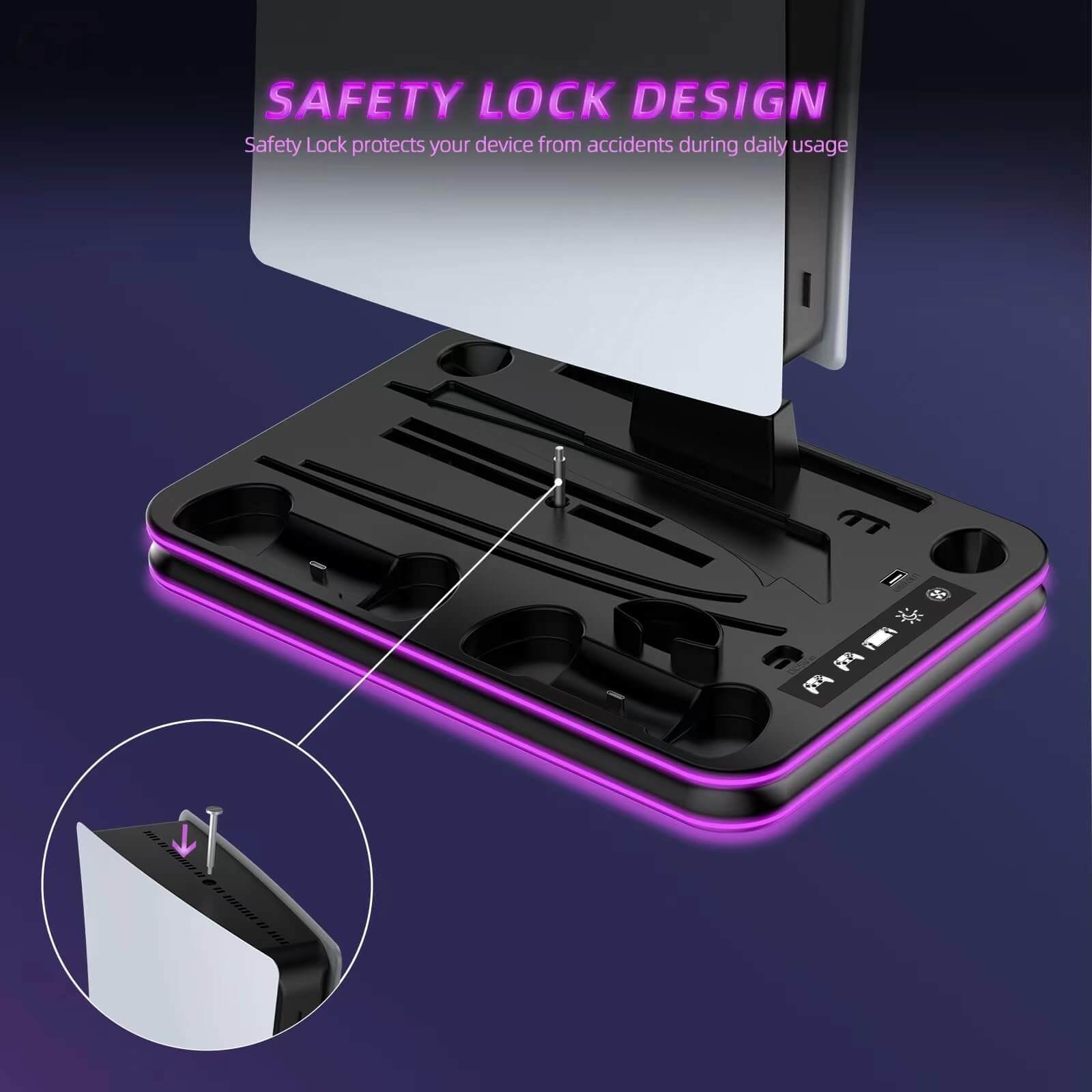 3 LEVEL PS5 COOLING FAN AND COOL RGB LIGHTING - The PS5 cooler stand vertical is equipped with a touch switch and 3 Level Cooling Fan, that suck hot air from the bottom of the console and effectively dissipate heat in all directions. The PS5 Multi-functional base with 5 vibrant RGB color options match your gaming ambiance and personal style. Long press the button for 2 seconds to turn on or off, short press for one second to switch the color.